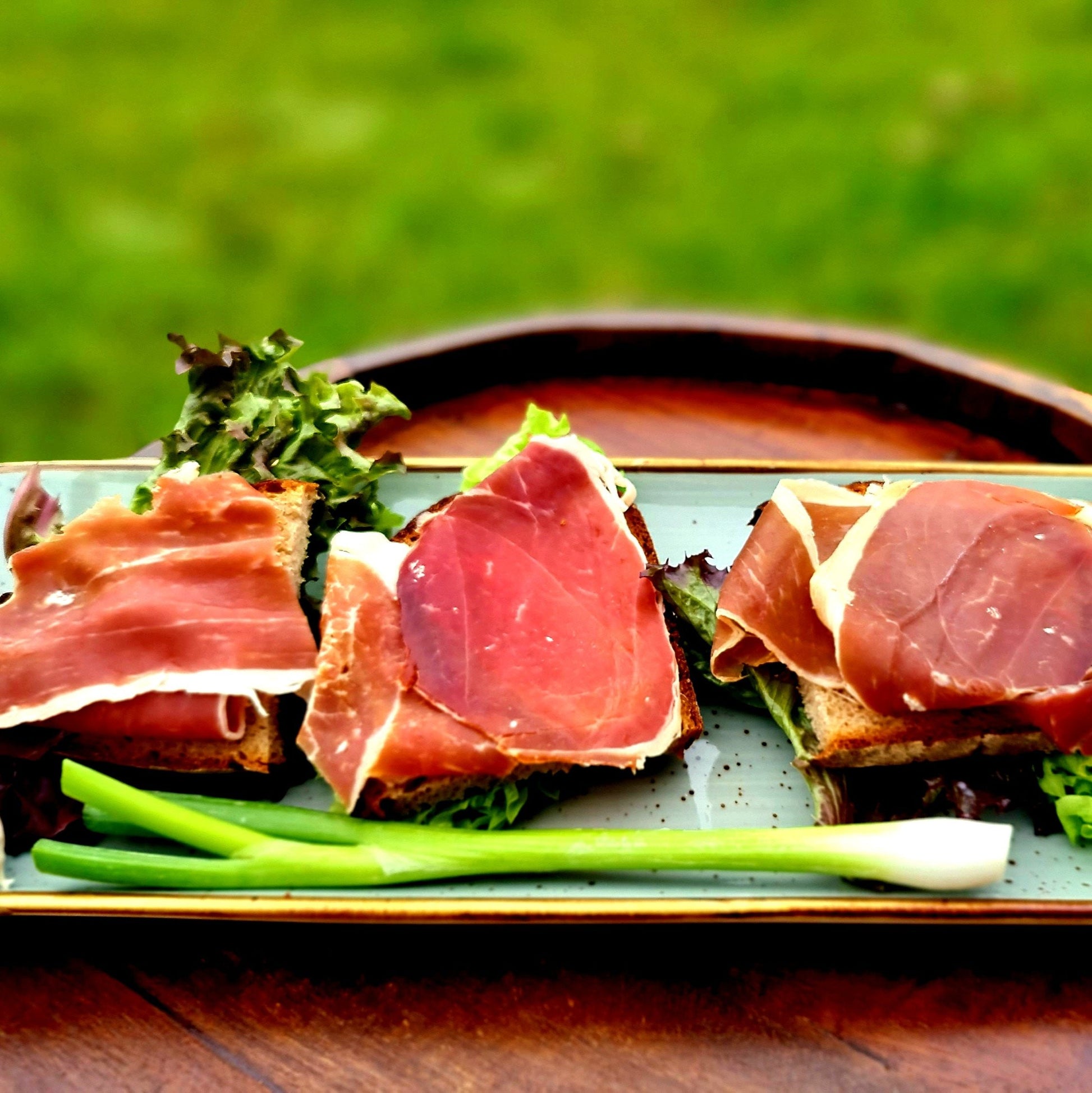 Verzehrempfehlung: Auf geröstetes Brot etwas Olivenöl und fein geriebenen Knoblauch geben, Jamón darauflegen und genießen. Passt perfekt zu unseren Weinen. Am besten bei Zimmertemperatur servieren. Guten Appetit!